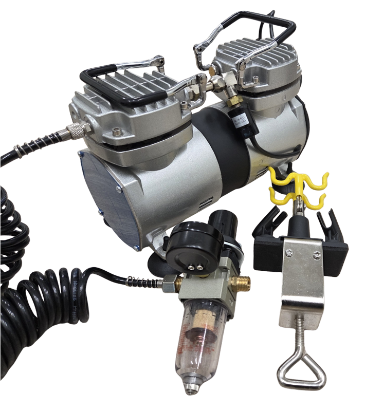 Piston compressors that are portable, compact, oilless and require no maintenance. Quiet performance - sound level barely above a whisper - with a hose for an airbrush. A simple on/off switch activates these compressors. Features also include an automatic shut-off switch which permits these compressors to turn themselves off when not in use and back-on when resuming airbrushing. This eliminates heat-related moisture build-up, reduces running time and minimizes motor wear.