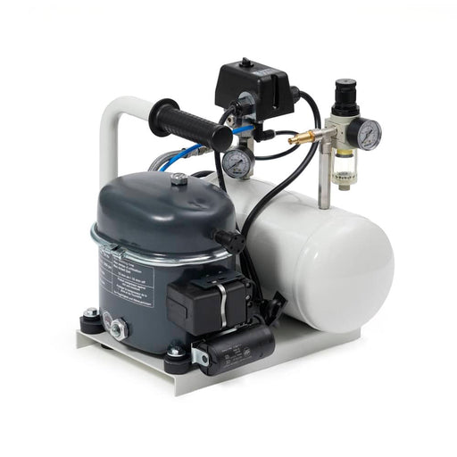 All Sil-Air compressors are virtually "noiseless" and are totally automatic. Each unit includes a tank and line pressure gauge, line pressure regulator, moisture trap/filter/gauge, safety-valve, air intake filter and a carrying handle or easy rolling for models with wheels. Sil-Air models feature one or more heavy-duty 1/2 horsepower pumps for extra reliability and durability. Also available in 220V.